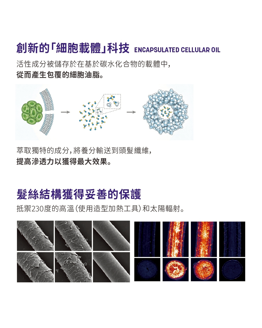 👉🏻用細胞油脂完整包覆萃取活性成份,將養分以最高滲透力送達髮纖維,獲得最大幅度的效果。